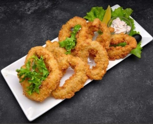 Deliciosos Anillos de calamar apanados, servidos con la salsa de la casa. ¡Ideales para compartir!