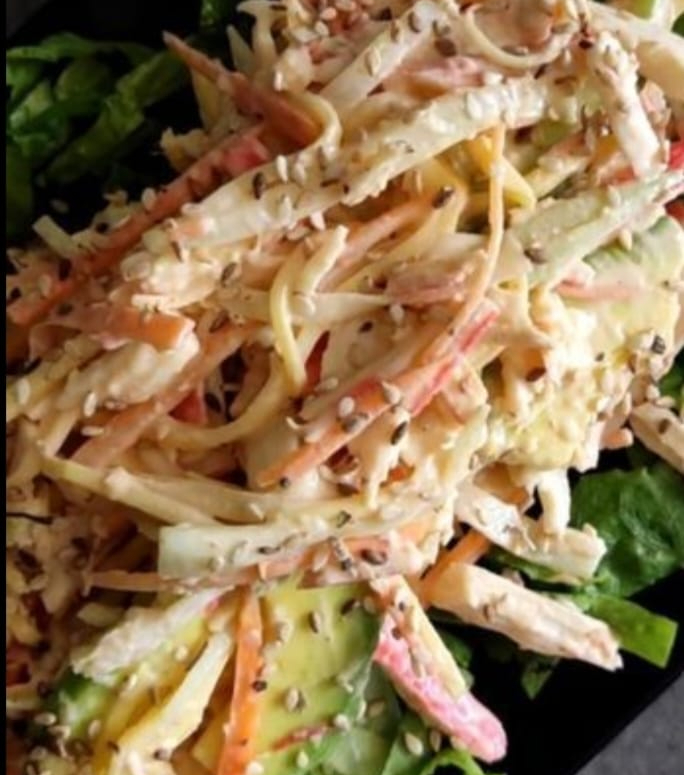Refrescante ensalada con Pepino, Cangrejo, aguacate, Mayonesa y Sésamo.