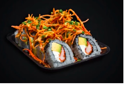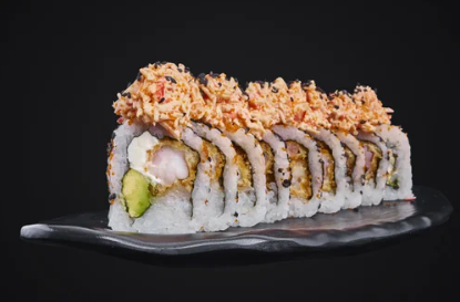 Kanikama crunchy, queso crema y aguacate con topping de camarones crunchy en salsa especial de la casa.