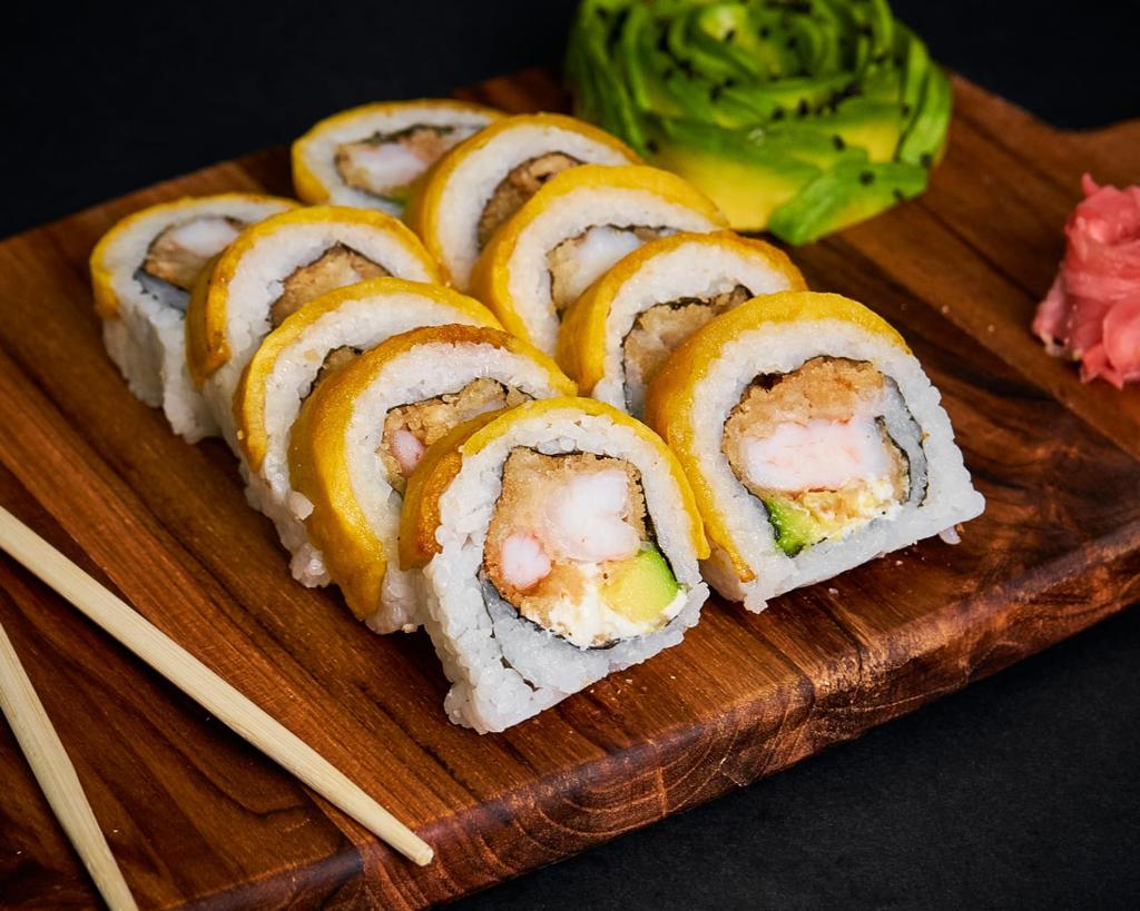 Salmón tempura, queso crema, aguacate, todo crocante.