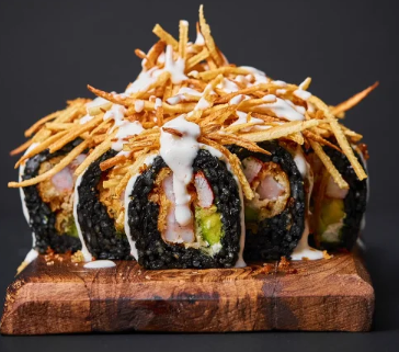 Camarón crunchy, queso crema, arroz recubierto de kanicruch, cebollin chino, topping de jamón serrano y tiras de kanicrunck en salsa kamikaze de la casa y toque de sésamo negro.