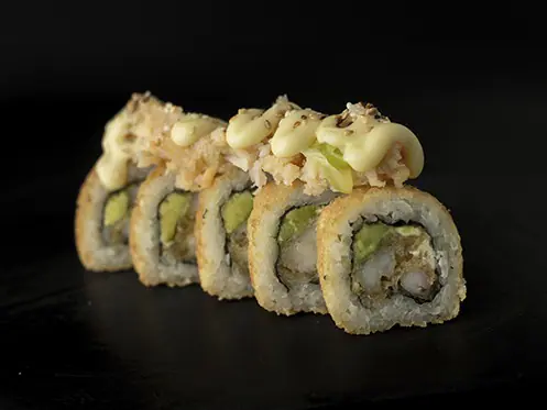 Roll de sushi relleno de pescado blanco tempurizado, salsa fuji y topping de aguacate.12 bocados