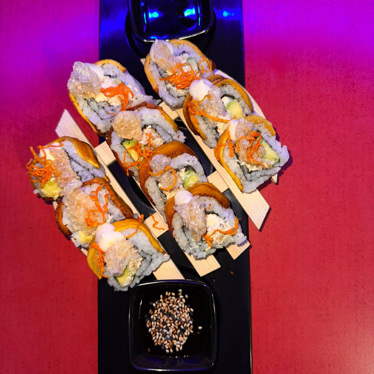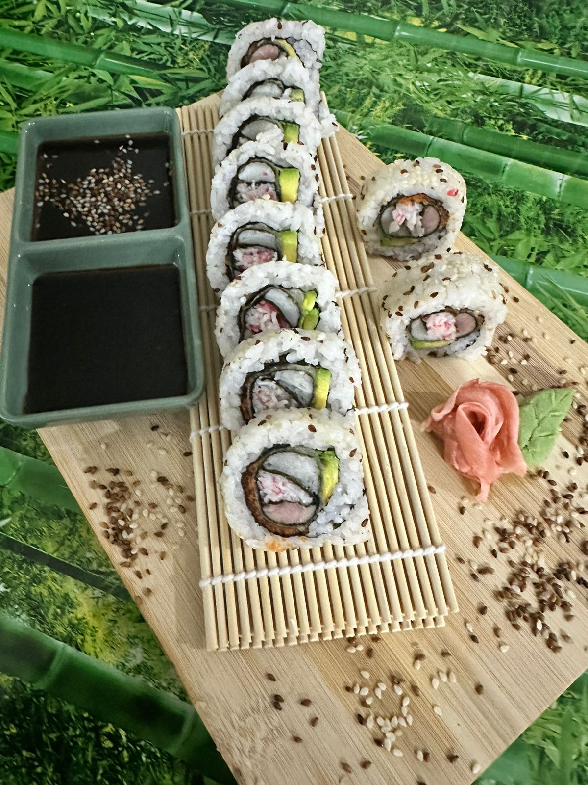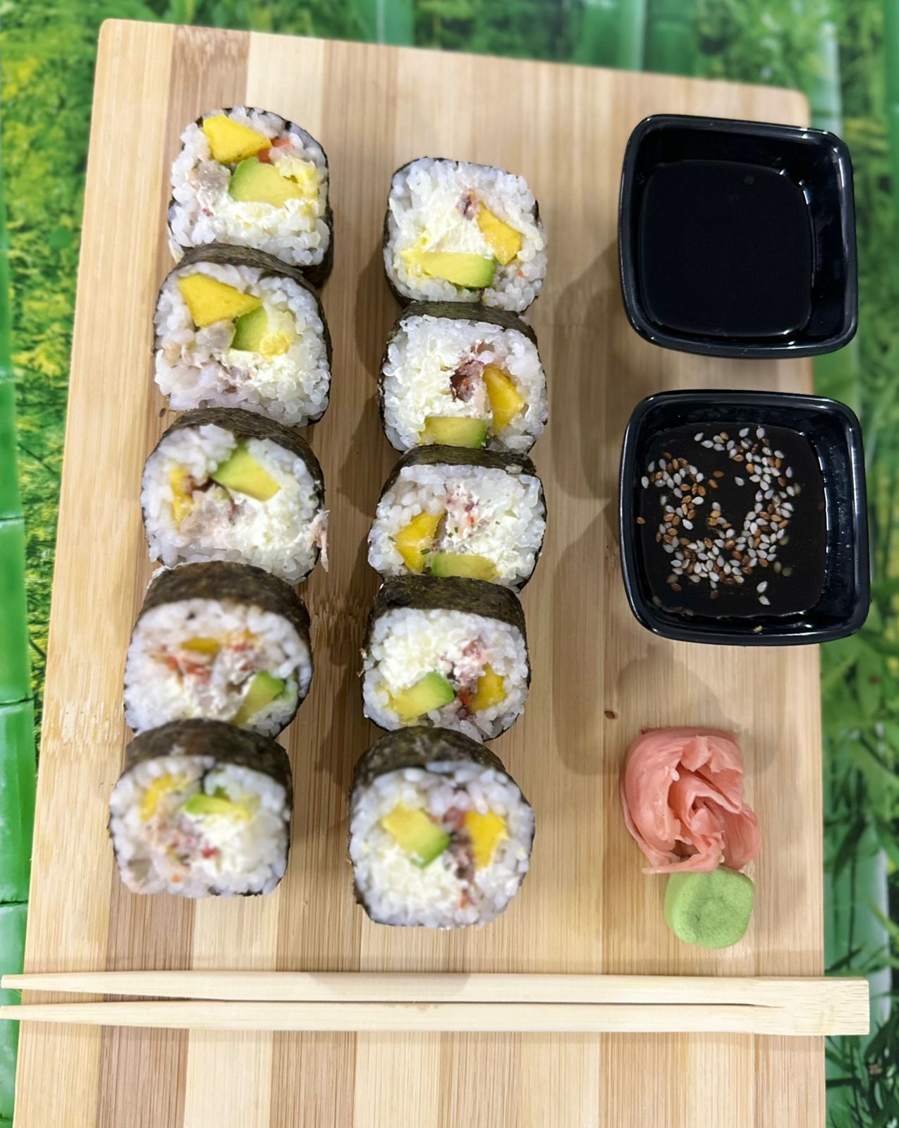 zanahoria,aguacate, pepino, mango y queso crema. con un topping de aguacate y ajonjoli