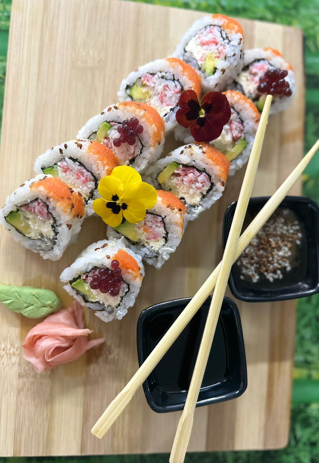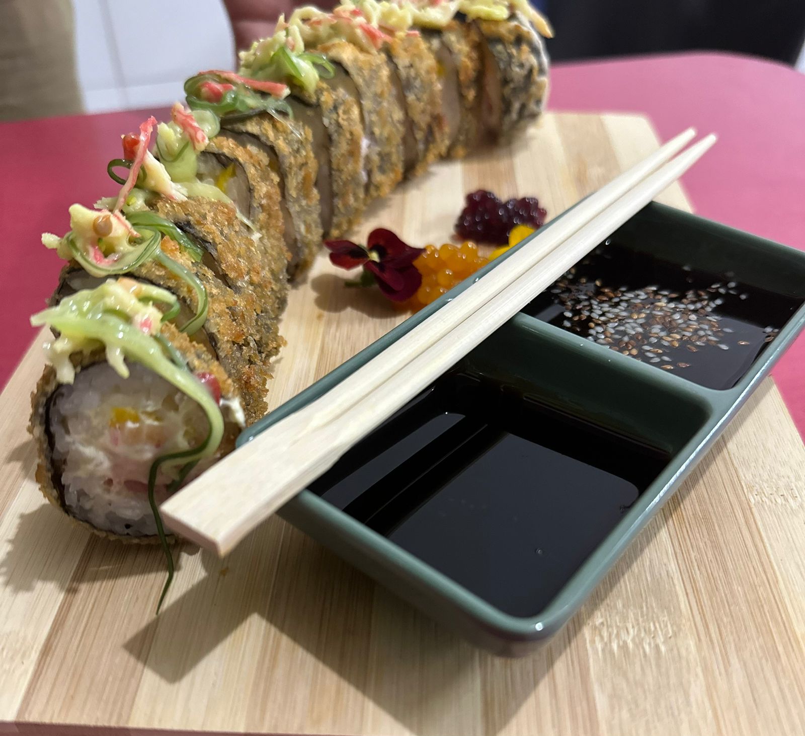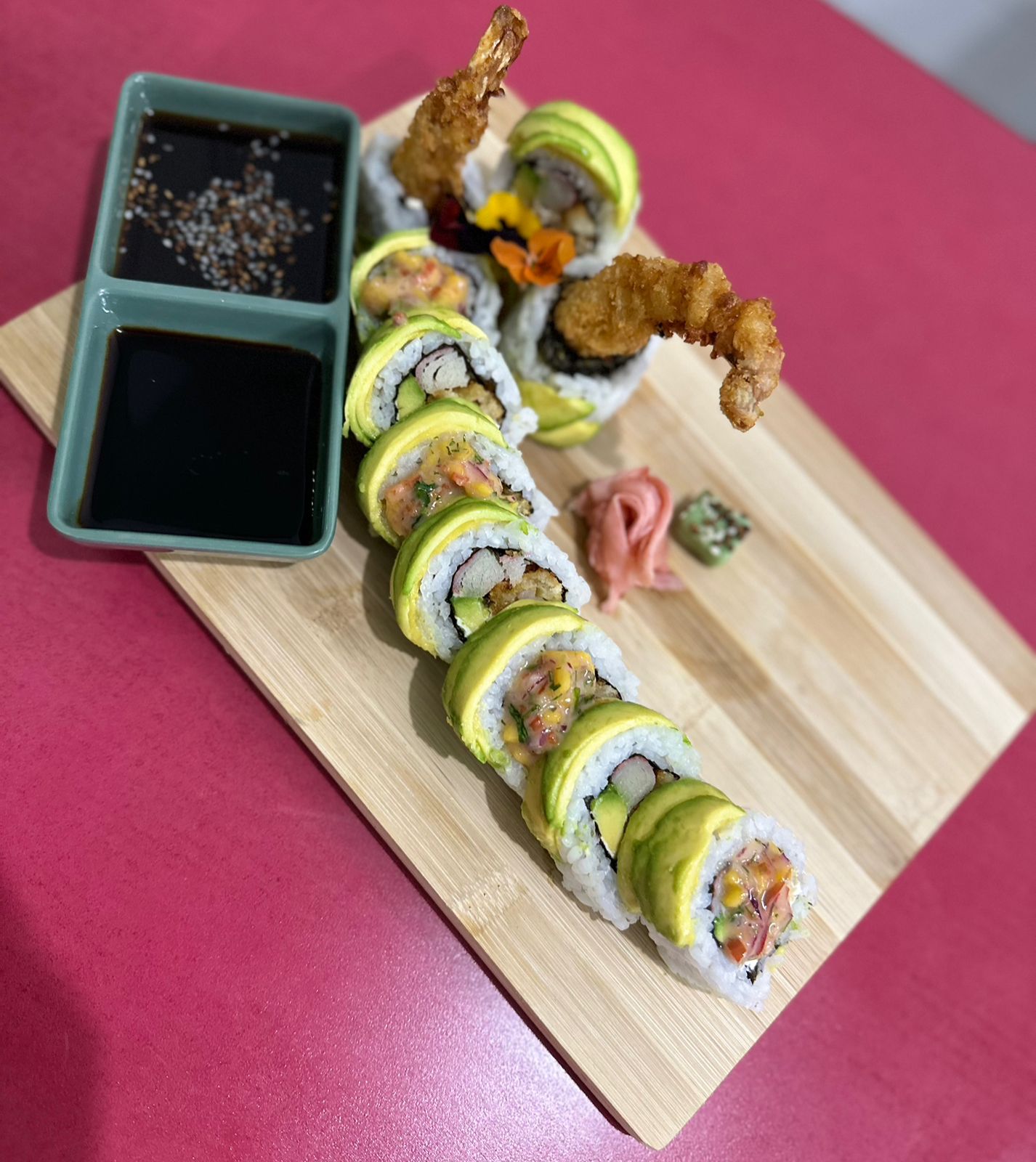 Espectacular rollo de salmón, atún, palmito de cangrejo desmechado, masago y aguacate