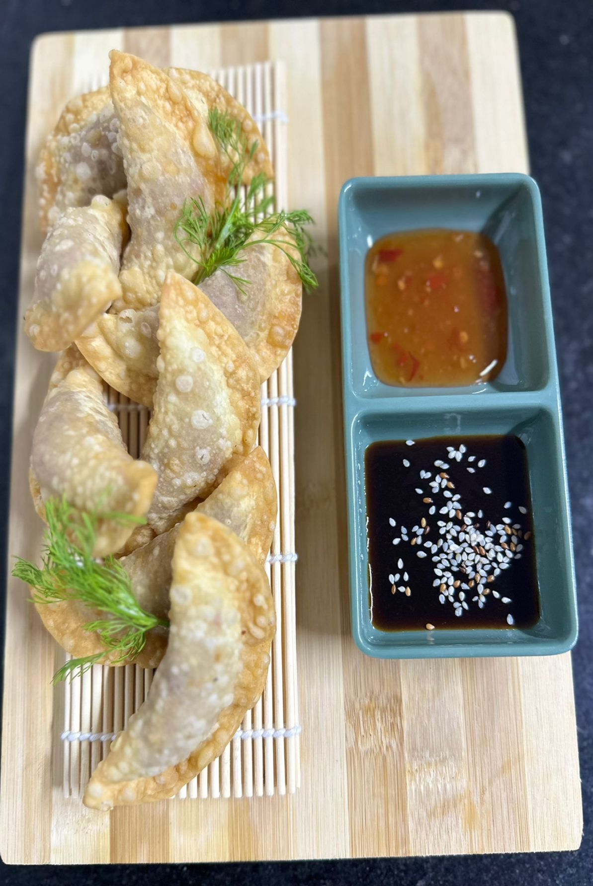 10 Bocados de empanadillas crocantes rellenas de camaron al estilo teriyaki.