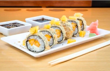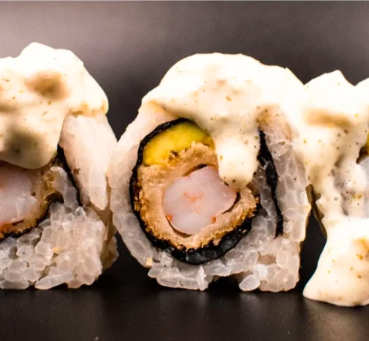 12 Piezas de sushi con langostinos tempura, queso crema, aguacate y plátano maduro con topping de tartar de kanikama ( salsa ligeramente picante ).