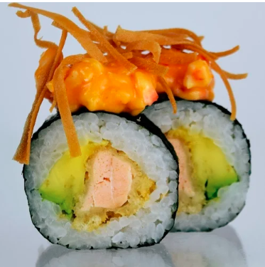12 Piezas de sushi con kanikama tempura queso crema aguacate con topping de cebolla crispy y bbq ahumada.