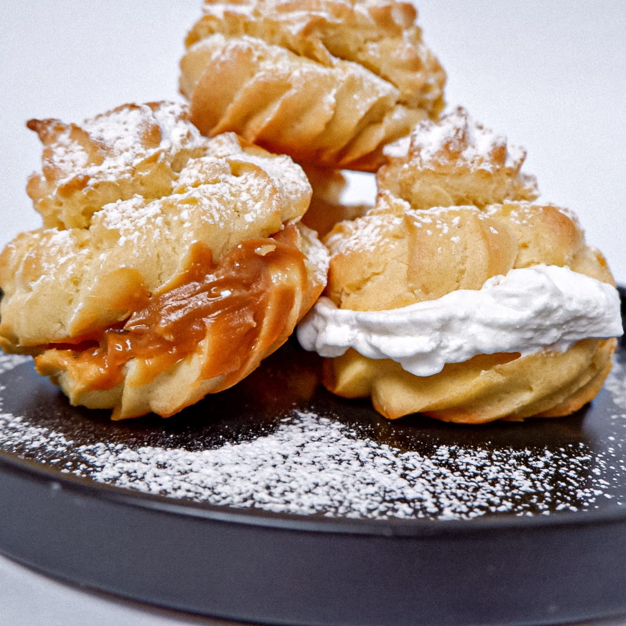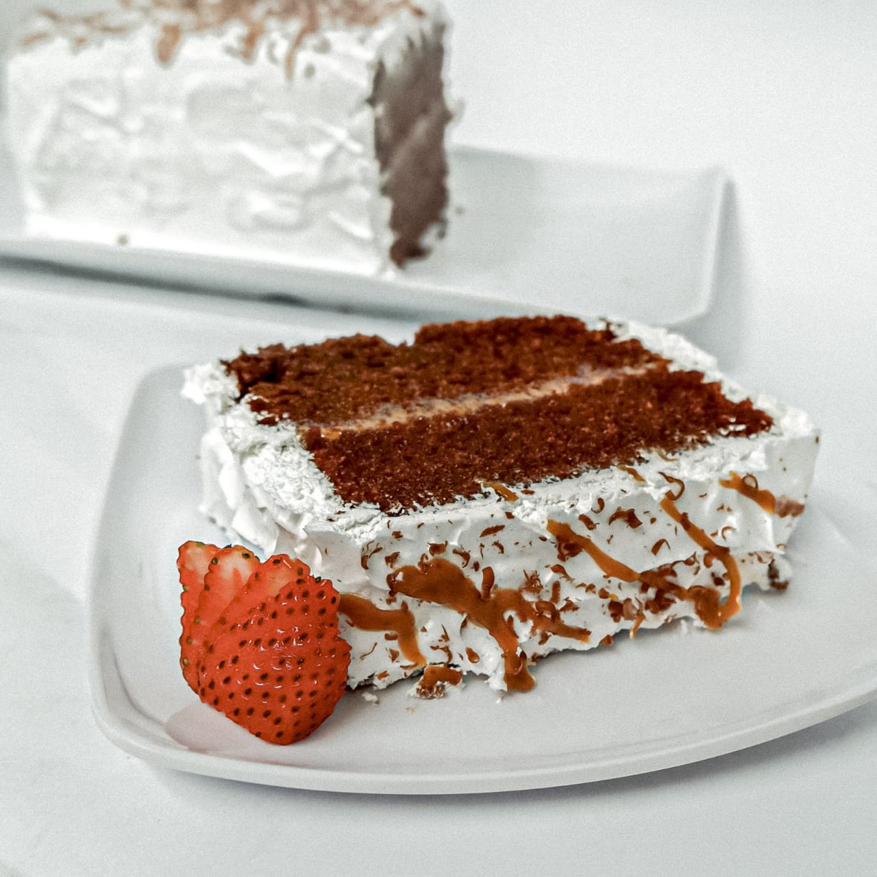 porción de torta Milkyway con chocolate y arequipe en el medio cubierta de crema chantilly
