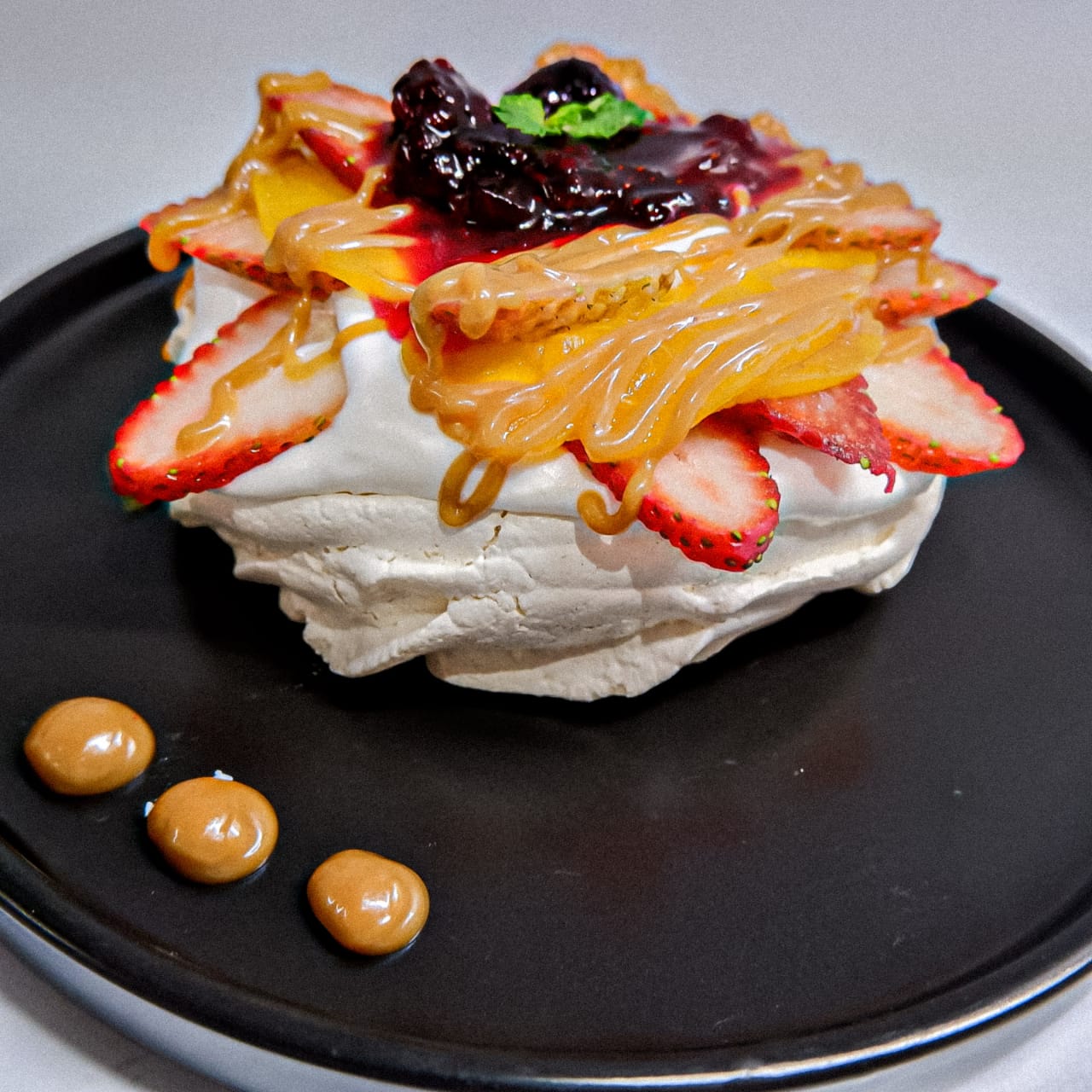merengue con crema chantilly frutas frescas con salsa de frutos rojos y arequipe