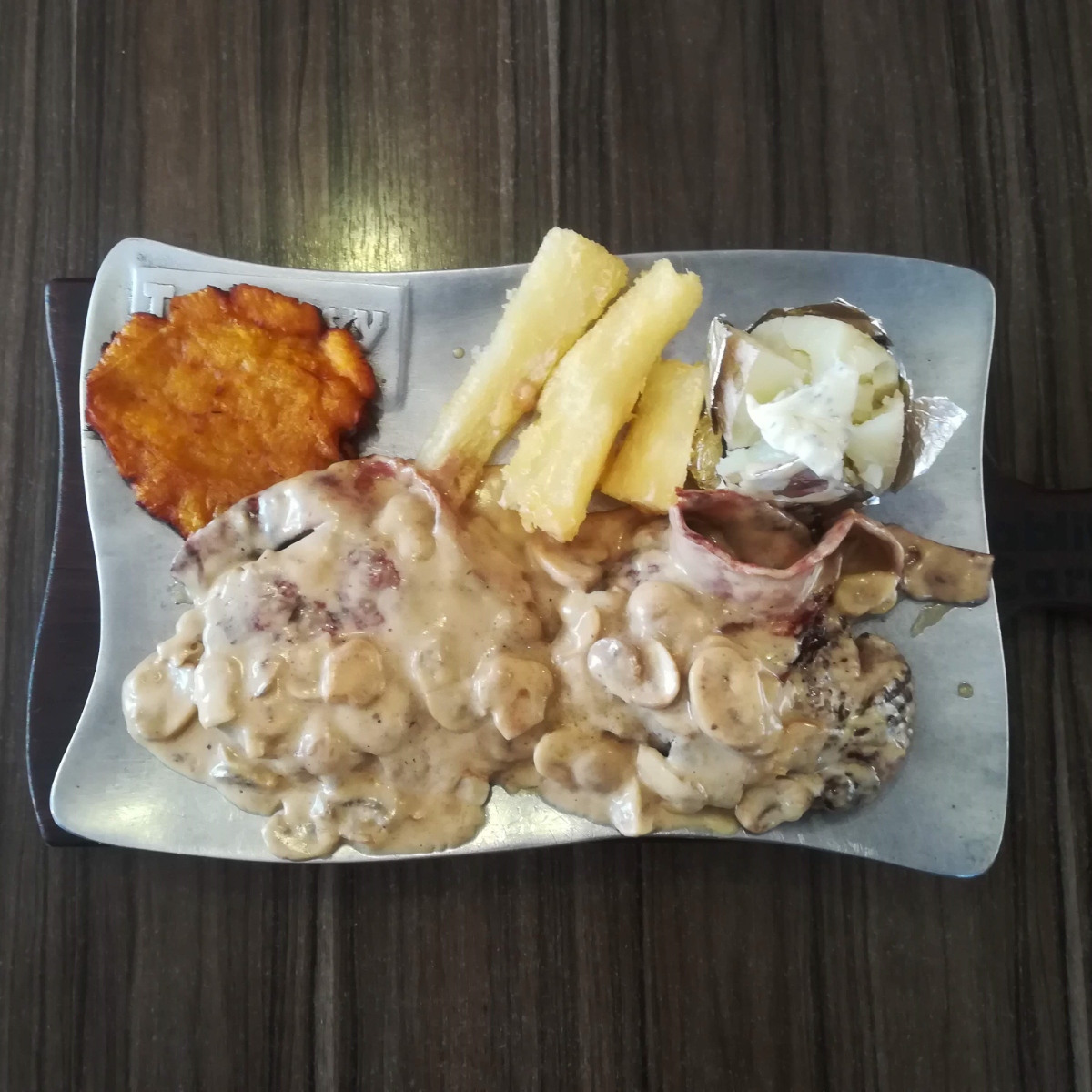 Elegancia en tu plato. Medallones de lomo de res a la parrilla, bañado en salsa al vino con champiñones y tocineta. Acompañado con papa al horno, yuca dorada, patacón y ensalada.