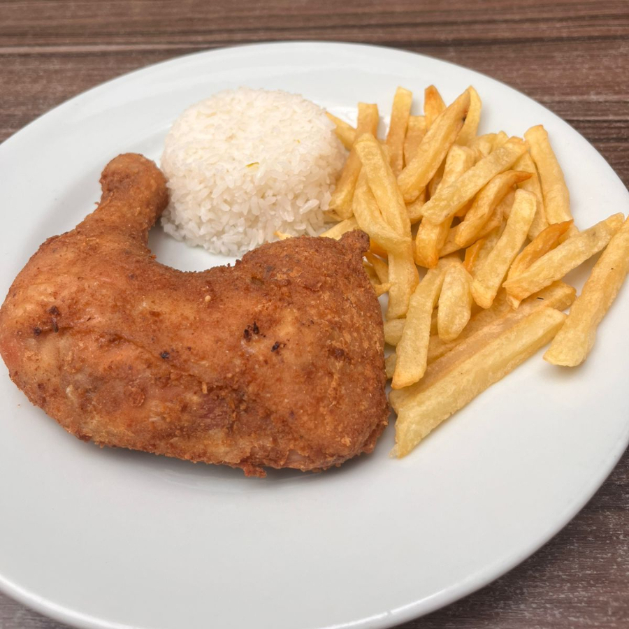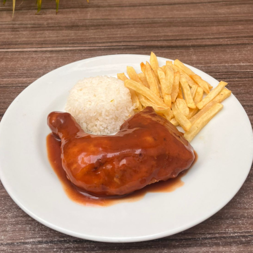 Pollo dorado con salsa BBQ con papa a la francesa y arroz