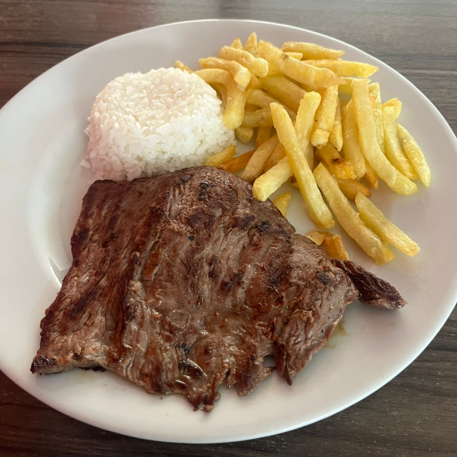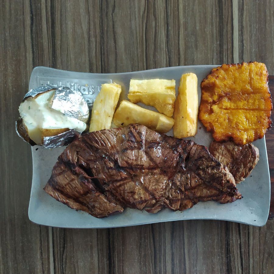Lomo de res en filete, a la parrilla. Acompañado con papa al horno, yuca dorada, patacón y ensalada.