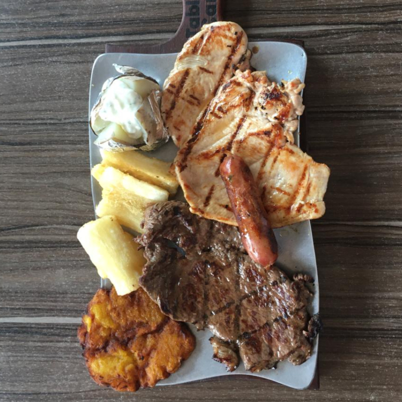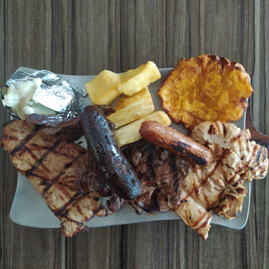 Carne de res, pechuga de pollo y chorizo, a la parrilla. Acompañado con papa al horno, yuca dorada, patacón y ensalada.