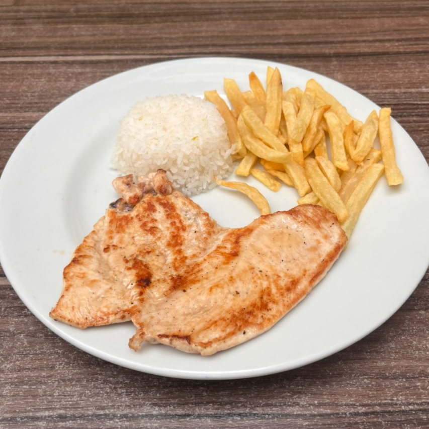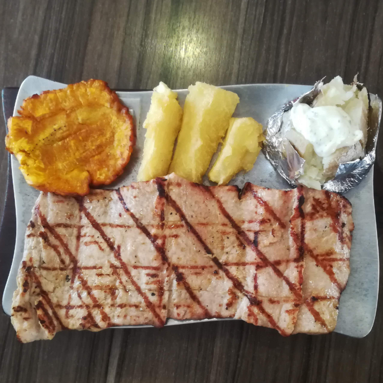 Filete de cerdo a la asado a la parrilla. Acompañado con papa al horno, yuca dorada, patacón y ensalada.