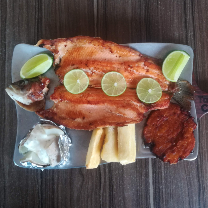 Trucha desahuesada y preparada a la plancha. Acompañada con papa al horno, yuca dorada, patacón y ensalada.