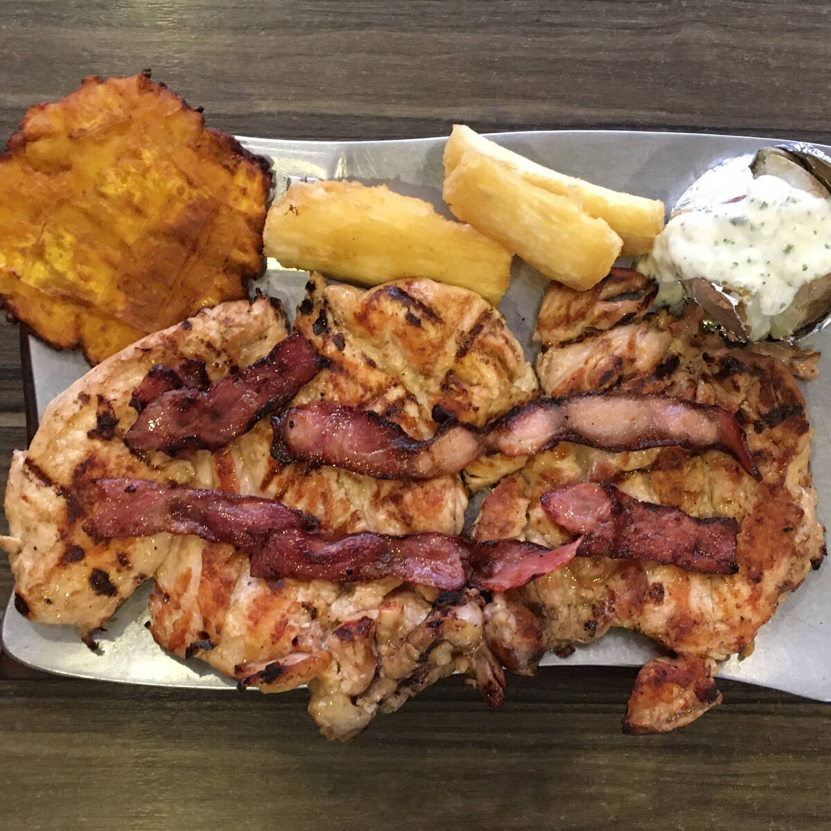 Medio pollo deshuesado a la parrila con tocineta dorada. Acompañado con papa al horno, yuca dorada, patacón y ensalada.
