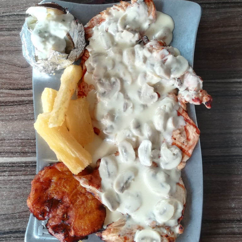 Filete de pechuga a la parrilla con salsa de champiñones. Acompañado con papa al horno, yuca dorada, patacón y ensalada.