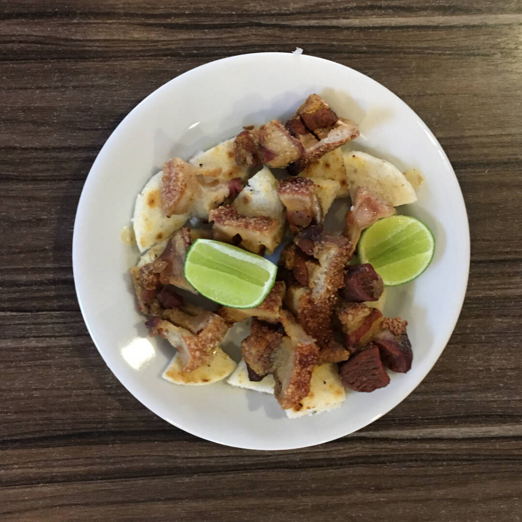 El chicharrón más crocante. Entrada de chicharrón carnudo acompañado de arepa paisa. ¡Un bocado irresistible!