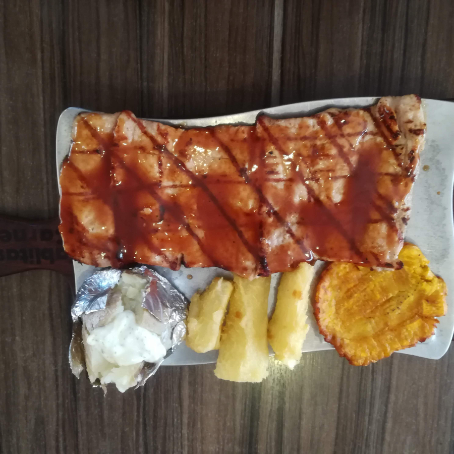 Costillas de cerdo a la parrilla bañadas en salsa BBQ. Acompañado con papa al horno, yuca dorada, patacón y ensalada.