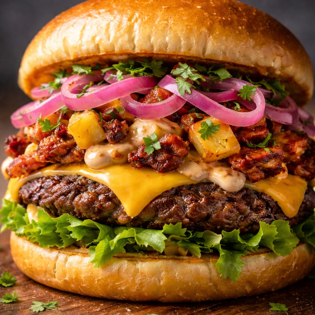 Smash de 100 gr, queso americano, pan brioche, carne de cerdo al pastor, trozos de piña, lechuga, cebolla encurtida, mayonesa al pastor y pico e gallo