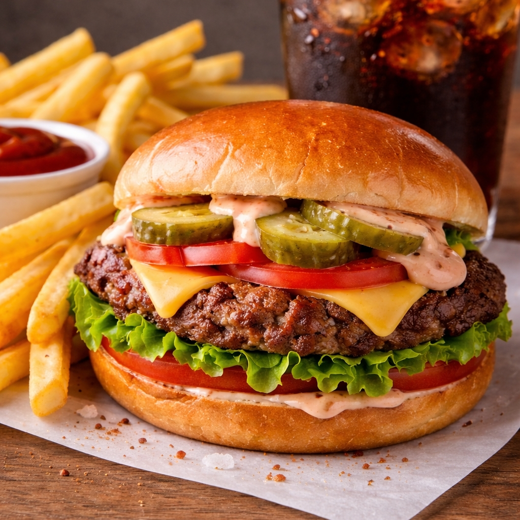 Pan brioche, carne smash 100gr, queso americano, salsa especial de la casa, vegetales pepinillos