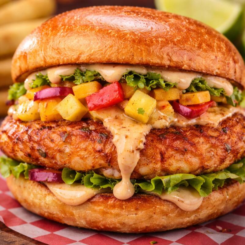 Hamburguesa de Tilapia 100% Artesanal, pan brioche, coleslaw, Salsa mango pineapple spicy