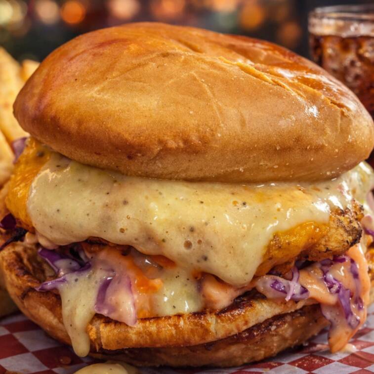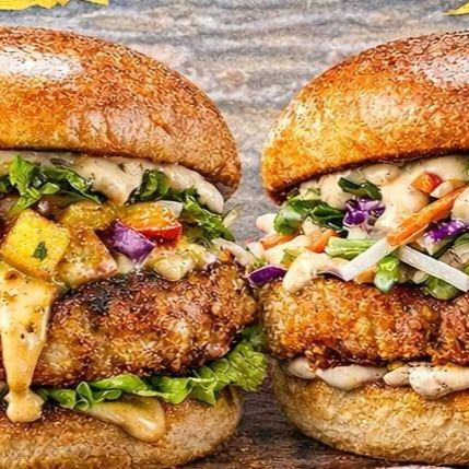 Hamburguesa artesanal de camarones, con trocitos de mango, cebolla encurtida,.salsa mango - piña con toques picantes, pan brioche, queso americano y coleslaw