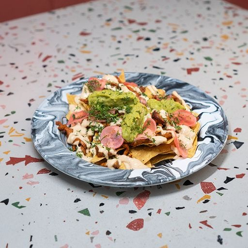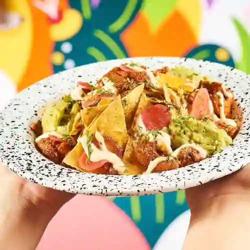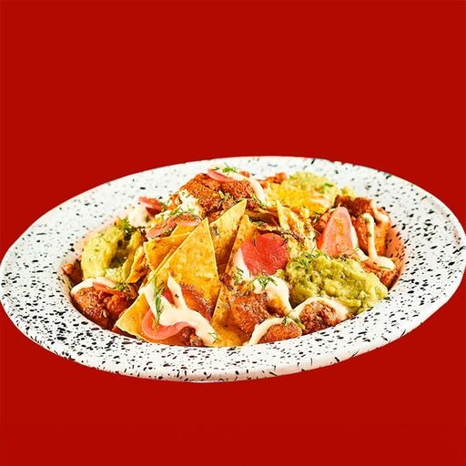 Totopos (nachos), carne de cerdo al pastor, guacamole, salsa chipotle, cilantro y rábanos encurtidos.