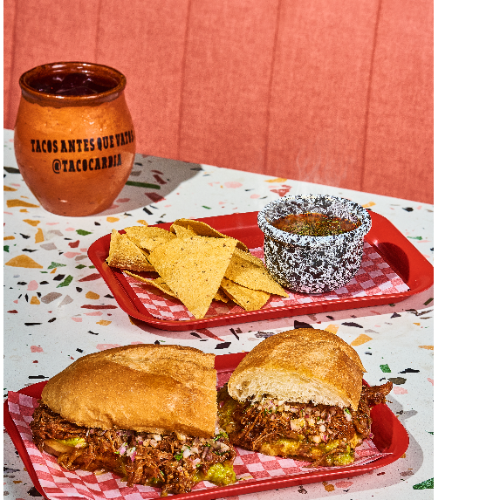 Incluye totopos crujientes y agua de panela fría. pan suave relleno con cerdo al pastor marinado en especias mexicanas, piña dulce, queso derretido, cebolla y cilantro, un almuerzo lleno de sabor y energía para el resto del día