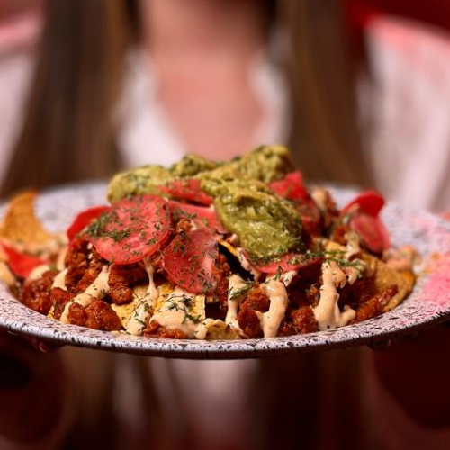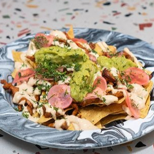 Totopos con cerdo al pastor, guacamole, cilantro, lactonesa de chipotle y rábanos encurtidos.