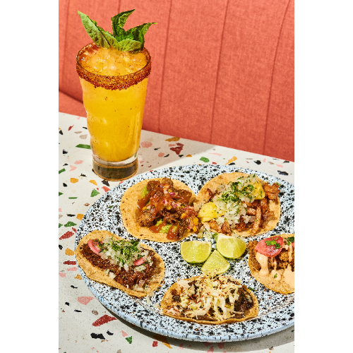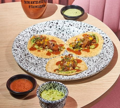 Taco con tortilla de maíz, chunchullo, guacamole, pico de gallo de mango, limón y jalea de guayaba.