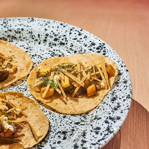 Taco con tortilla de maíz, berenjenas salteadas, aceite infusionado, plátano frito, queso mozzarella, crema ácida, tortilla frita, limón y cilantro.