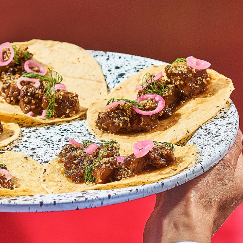 Totopos con res en salsa, guacamole, cilantro, lactonesa de chipotle y rábanos encurtidos.
