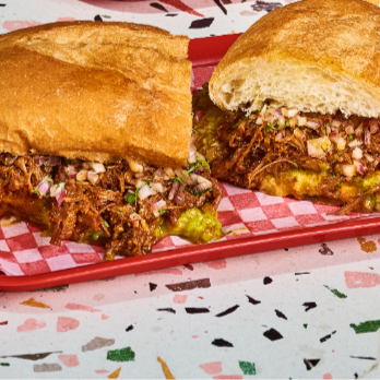 Pan suave y ligeramente tostado, relleno con cerdo al pastor marinado en especias mexicanas y piña dulce. lleva queso derretido, cebolla y cilantro fresco para un bocado lleno de contraste, sabor y frescura.