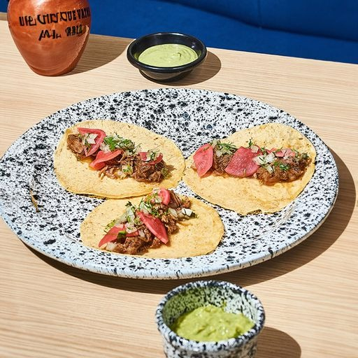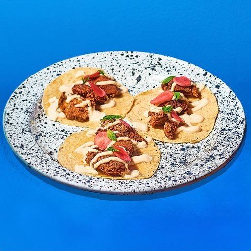 Taco con tortilla de maíz, pollo frito, lactonesa de chipotle, encurtido rábano y hierbabuena.