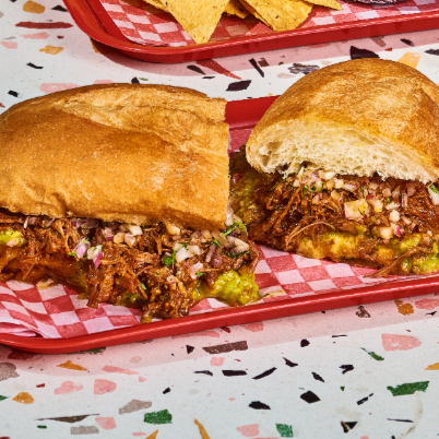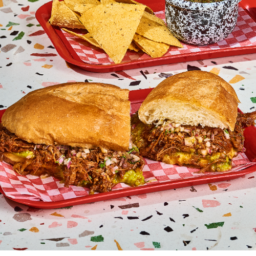 Incluye totopos crujientes, caldo caliente de birria y agua de panela fría, nuestra torta de birria viene con queso derretido, guacamole fresco, picadillo, cebolla y cilantro para un almuerzo completo y lleno de sabor.