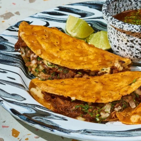 Suave tortilla de maíz rellena con jugosa carne de res cocinada lentamente en nuestro consomé secreto de especias mexicanas, acompañado de queso derretido, cebolla y cilantro fresco