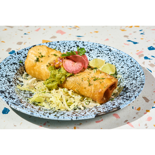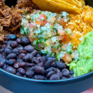 Incluye carne de res jugosa, frijol negro, arroz, guacamole fresco, lechuga crujiente y queso derretido. un plato completo, lleno de color y sabor, ideal para los que buscan algo fresco y contundente.