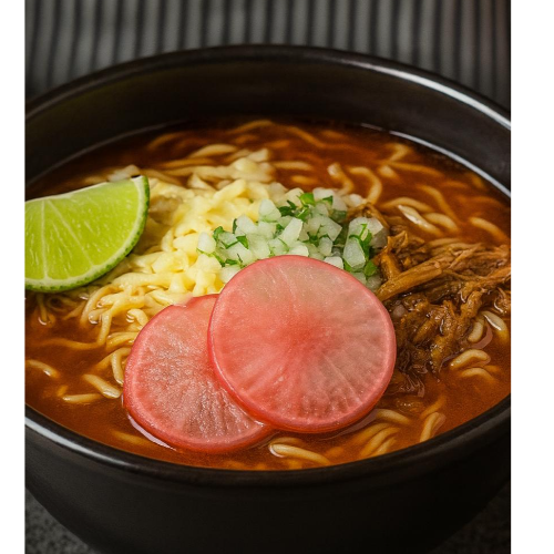 El ramen con un toque 100 mexicano, fideos en caldo caliente y aromático de birria cocinada por horas en nuestro consomé secreto, con jugosa carne de res, queso derretido, rábanos frescos, cebolla y cilantro, para un contraste de texturas y sabores que te hará repetir, reconfortante, intenso y totalmente adictivo.
