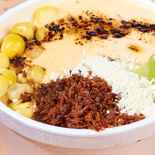 Maíz tierno servido en su caldo, acompañado de mayonesa de ajo, un toque de aceite de chile y queso costeño.