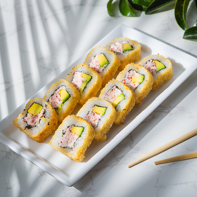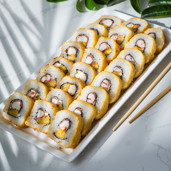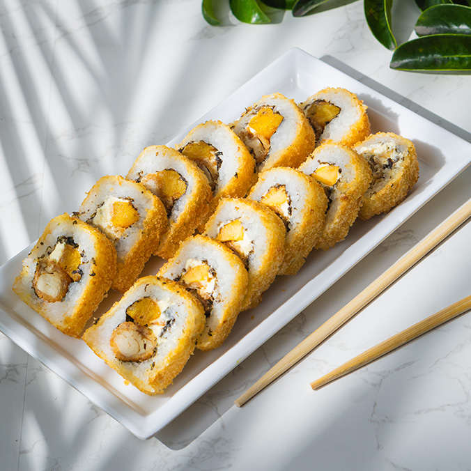 12 bocados de sushi Philadelphia Tempura (Salmón fresco, queso crema y aguacate, todo tempura ).
