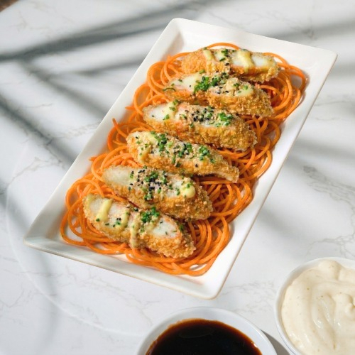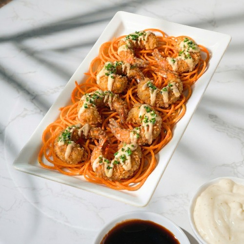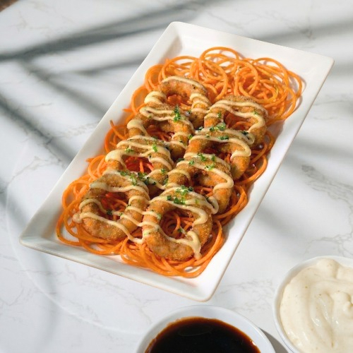 8 camarones crunch, salsa fantasy, cebollín y una cama de zanahoria en espiral.