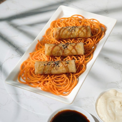 3 spring roll, salsa teriyaki, ajonjolí mixto y una cama de zanahoria en espiral.
