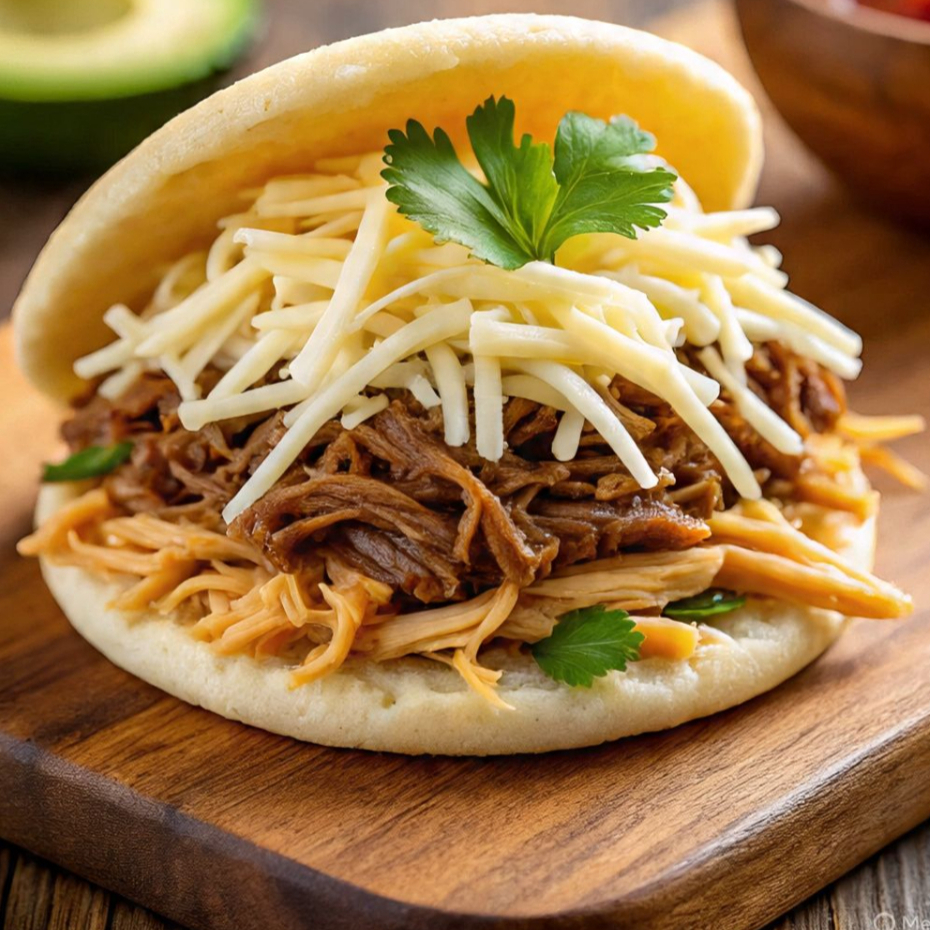 Carne Desmechada con Pollo Desmechado, queso costeño y salsa de la casa.