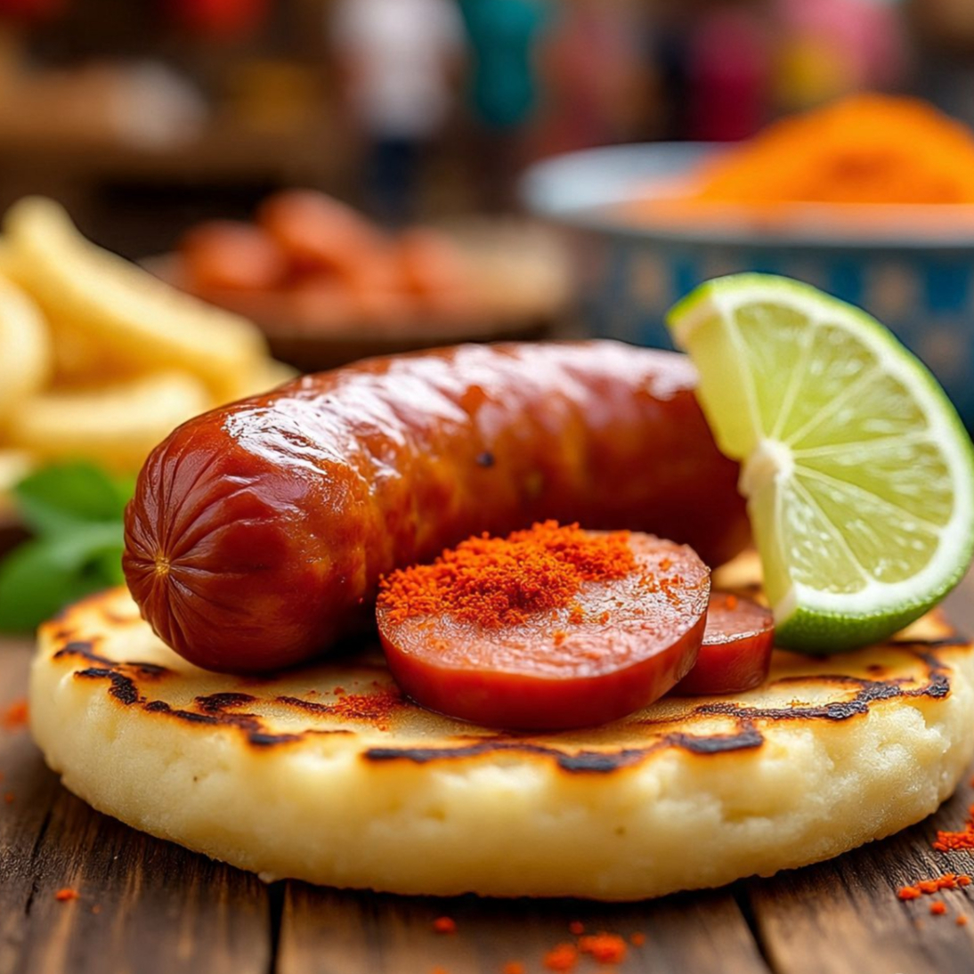 Arepa con chorizo y salsa de la casa.