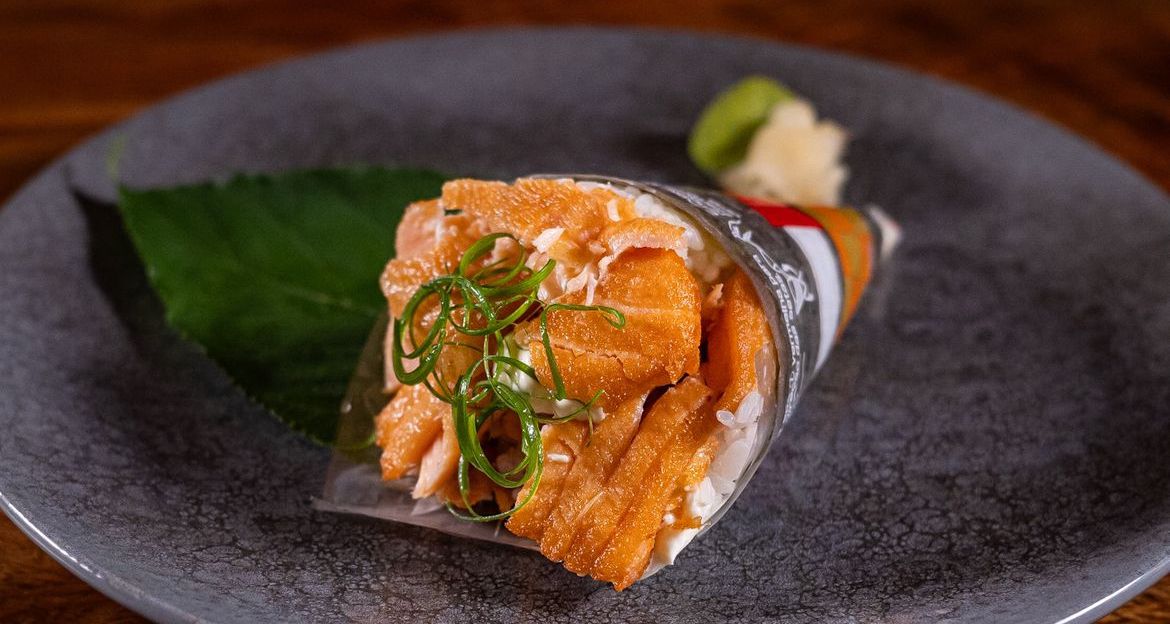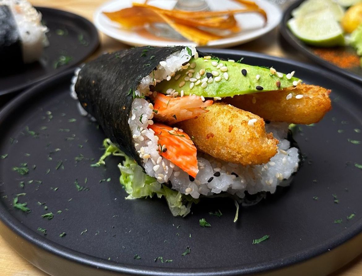Temaki relleno langostino crocante, queso crema, ajonjolí, chicharrón de pescado, aguacate, mayonesa japonesa, acompañado de salsa soya y teriyaki.