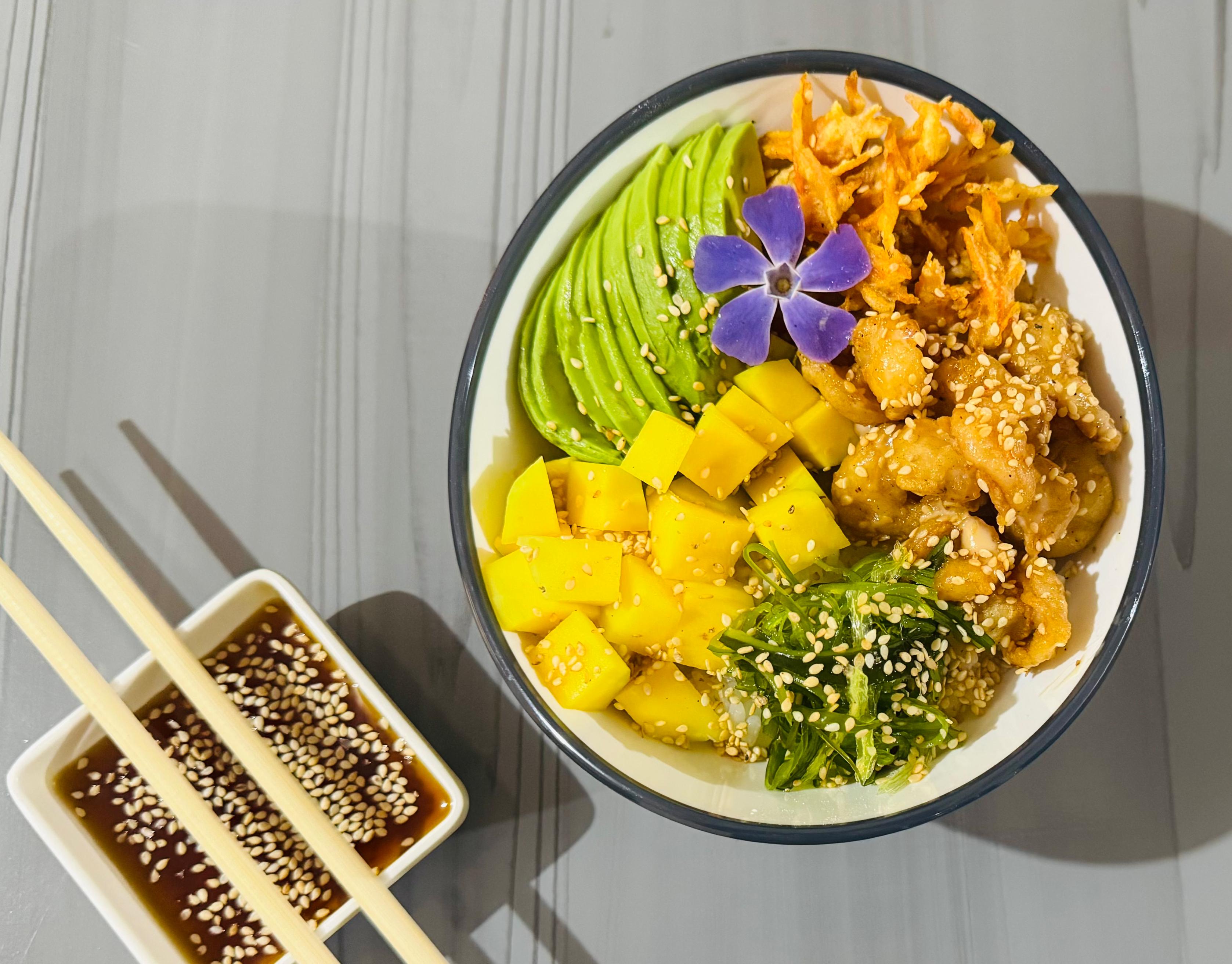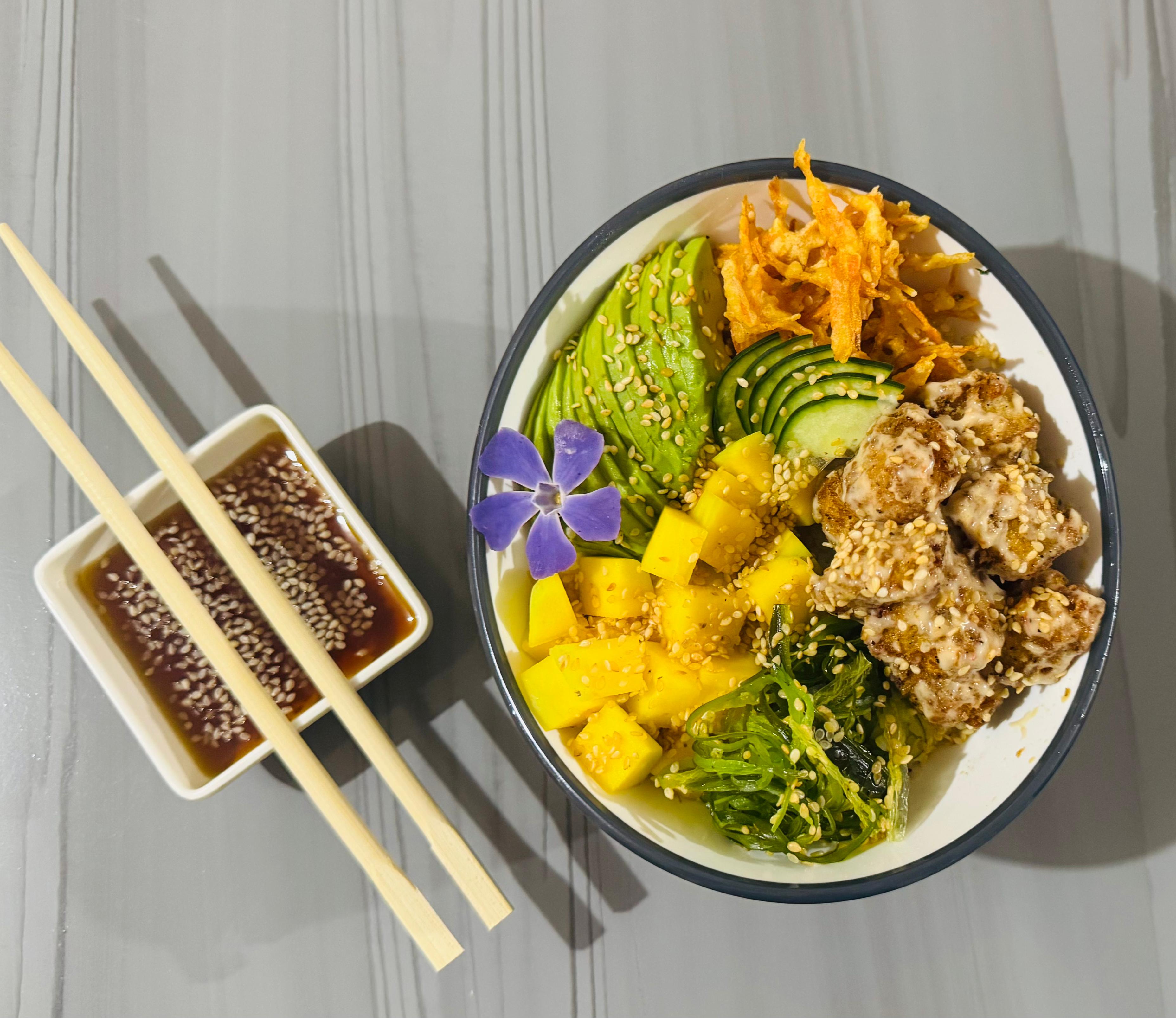 Pescado apanado rebosado en salsa Samurai, acompañado Arroz sushi, Aguacate, zanahoria crocante, ajonjolí, pepino encurtido,Ensalada algas, mango. Acompañado de salsa ponzu.