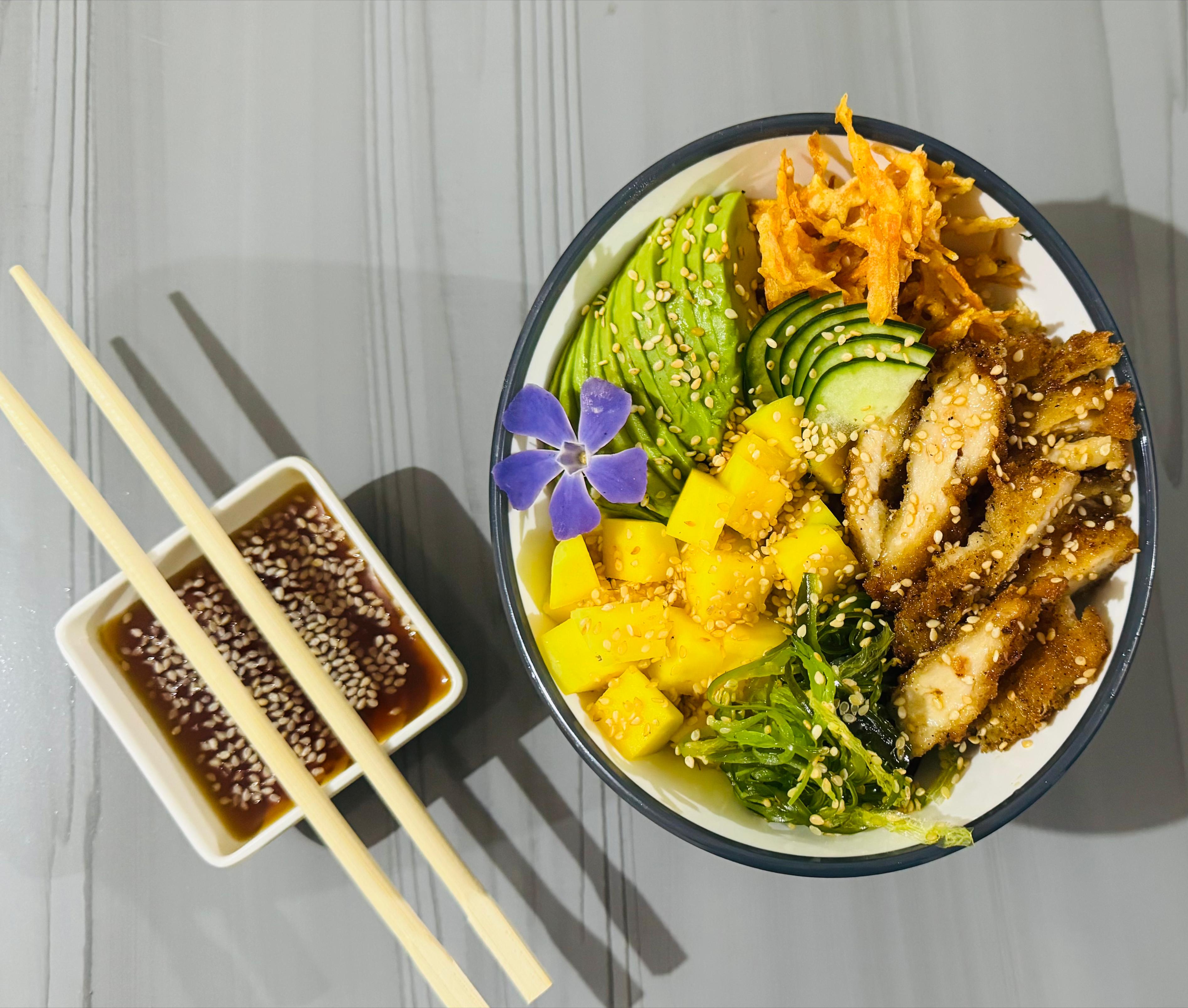 Pollo apanado rebosado en salsa Samurai, acompañado arroz sushi, Aguacate, zanahoria crocante, ajonjolí, pepino encurtido,Ensalada algas, mango. Acompañado de salsa ponzu.