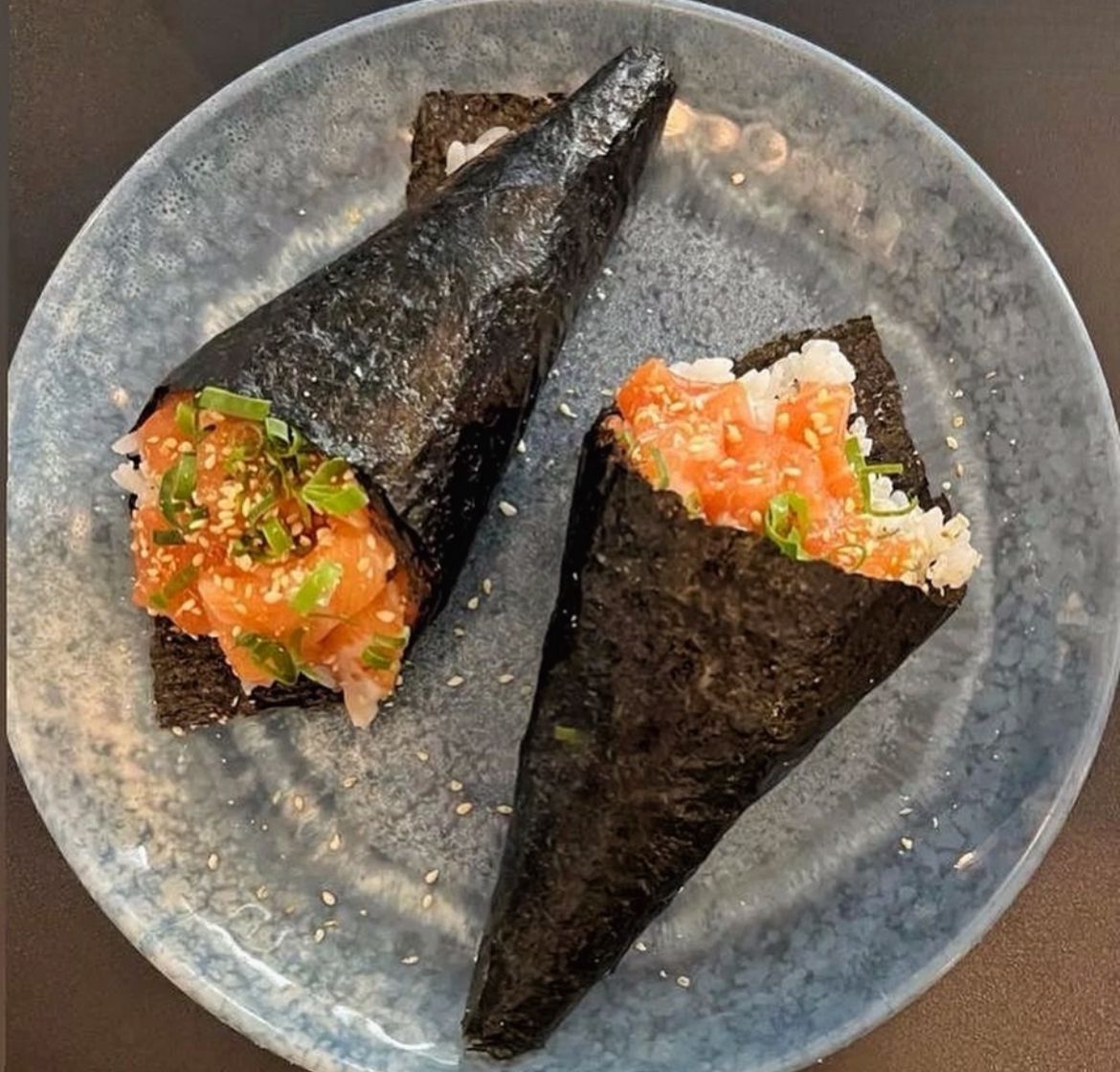Temaki relleno de salmón fresco, queso crema, aguacate, ajonjolí, acompañado de soya y teriyaki.