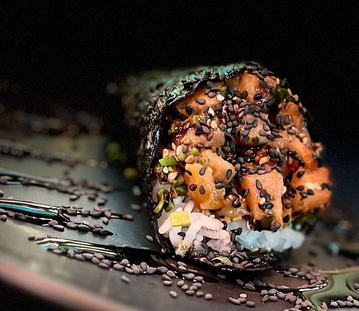 Maki relleno de salmon, pescado, kanikama, masago y aguacate, con topping de mayonesa japonesa y ajonjoli tostado.